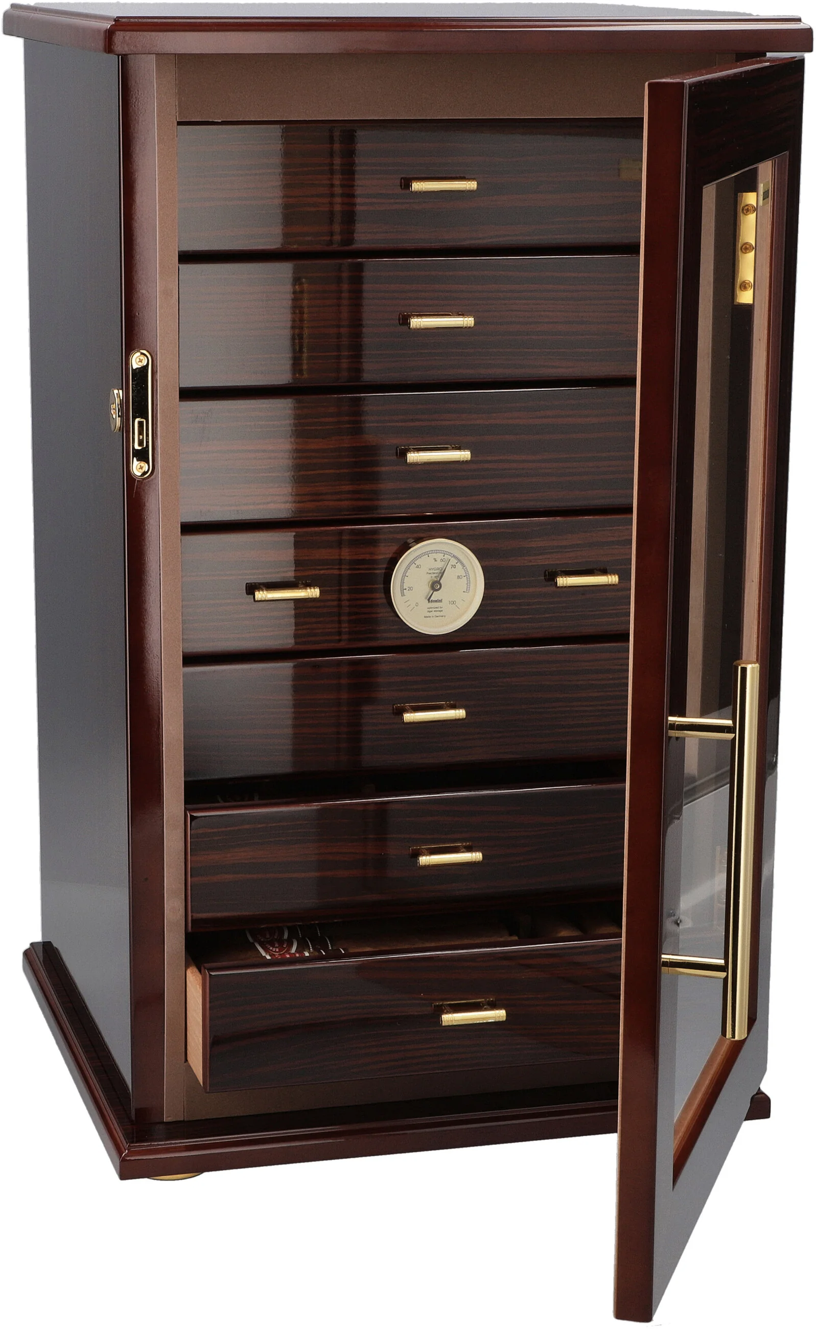 Die gedämpften Schubladen aus spanischem Zedernholz und die Innenverkleidung arbeiten mit dem luxuriösen, vergoldeten Befeuchter auf Acrylpolymerbasis von adorini zusammen, um die optimale Umgebung für Zigarren zu schaffen. Mit den verstellbaren Öffnungen für die Luftzirkulation des Befeuchters können Sie die Luftfeuchtigkeit genau auf das richtige Niveau für Ihre Sammlung einstellen. Mit einem vorkalibrierten Präzisions-Haarhygrometer an der Vorderseite der mittleren Schublade, der bei geschlossener Tür durch das Glas sichtbar ist, können Sie die Luftfeuchtigkeit schnell überprüfen.