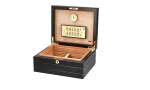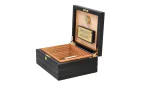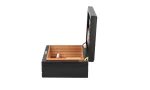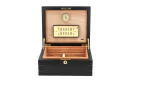 Der Firenze Deluxe Zigarrenhumidor fällt sofort ins Auge durch sein elegantes, mehrfach lackiertes, schwarzes Finish, die tiefliegenden, geriffelten Linien und dem vergoldetes Schloss mit vergoldetem Schlüssel, welche ihm Charakter verleihen. Die solide Konstruktion wird sofort beim Öffnen des stabilen, formschlüssigen Deckels deutlich, der durch starke, handpolierte 24K Gold Quadrant-Scharniere unterstützt wird. Im Inneren der fachmännischen Kreation sorgen gedämpftes spanisches Zedernholzfurnier und adorinis luxuriöser, vergoldeter Befeuchter für ideale Bedingungen für bis zu 68 Zigarren im Corona-Format.