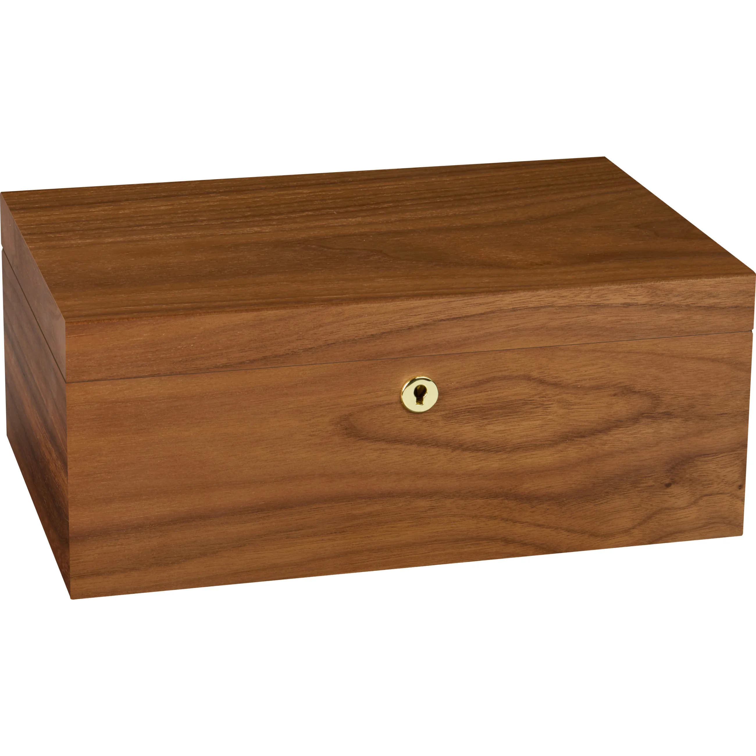 Das Walnussholz überzeugt durch seine charakteristische Maserung mit warmbraunen bis dunkelbraunen Farbtönen. Dank seiner warmen und natürlichen Ausstrahlung fügt sich der Humidor harmonisch in nahezu jedes Ambiente ein. Humidore der Größe Grande fassen bis zu 150 Zigarren und bieten damit ausreichend Platz für Ihre Zigarrensammlung.