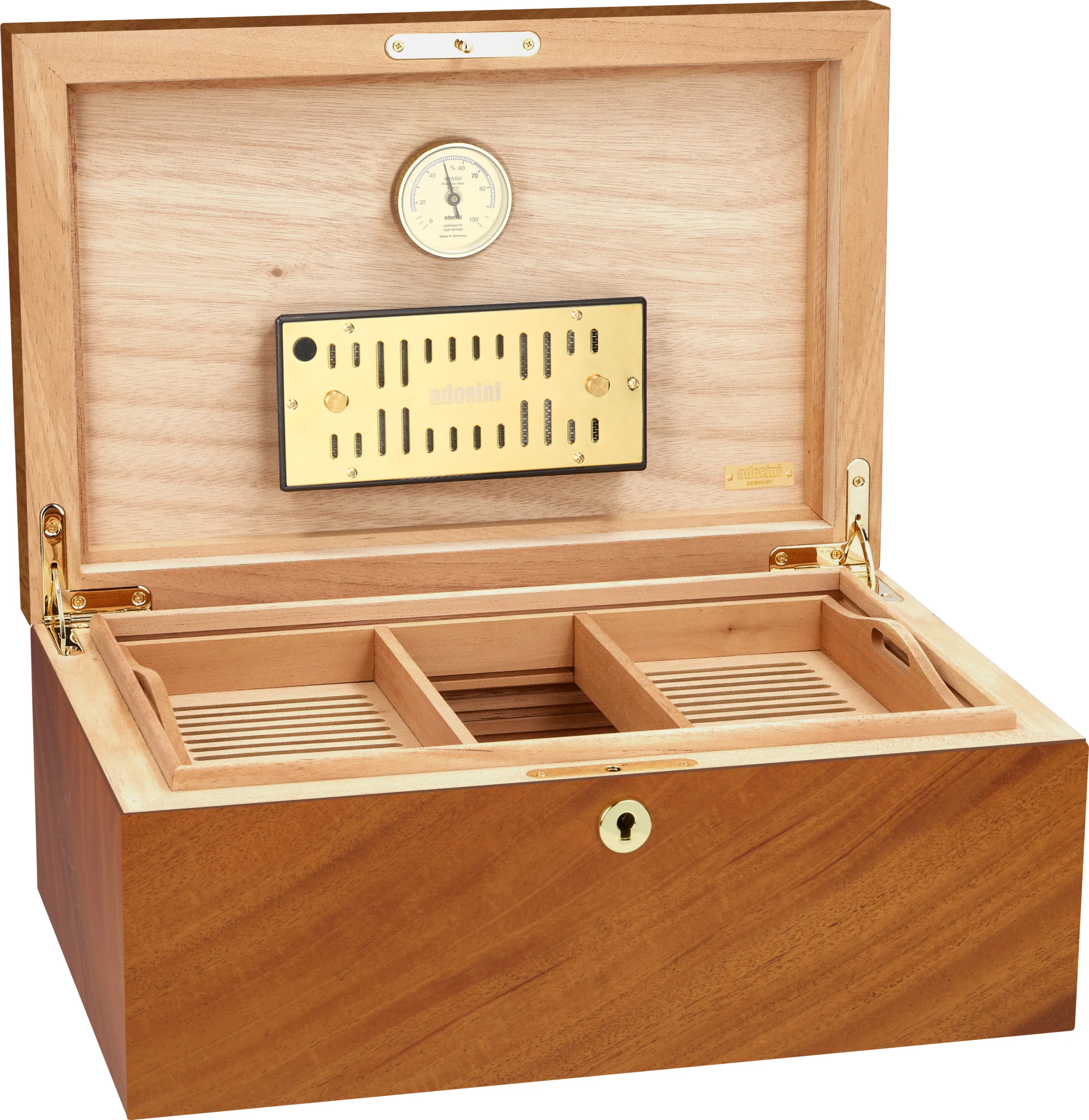 Das Modell Mahagoni besticht durch einen warm-braunen Farbton mit gut sichtbarer geschwungener Maserung und wirkt dadurch besonders edel und fügt sich hervorragend in jedes Ambiente ein. Die Humidore der Größe Grande fassen bis zu 150 Zigarren und bieten damit viel Platz für die Sammlung anspruchsvoller Genießer.