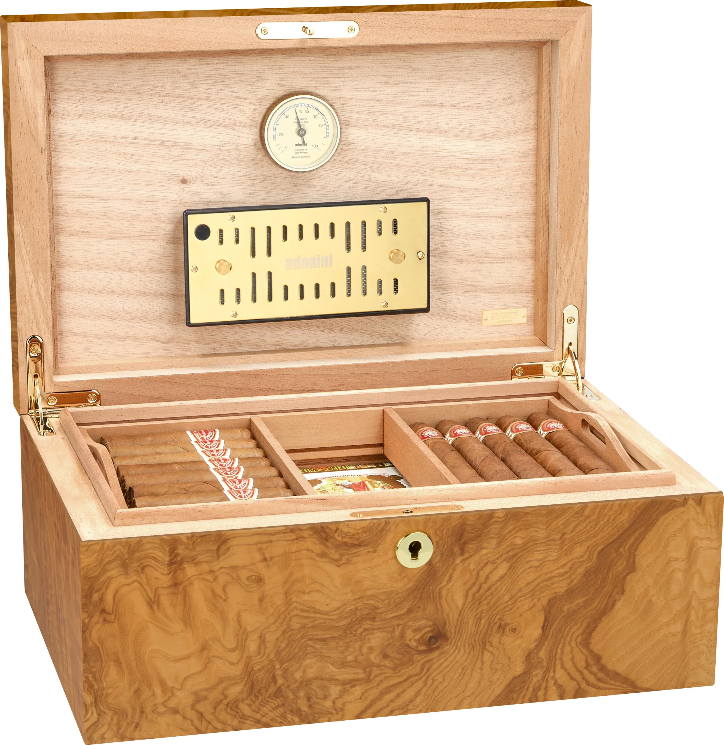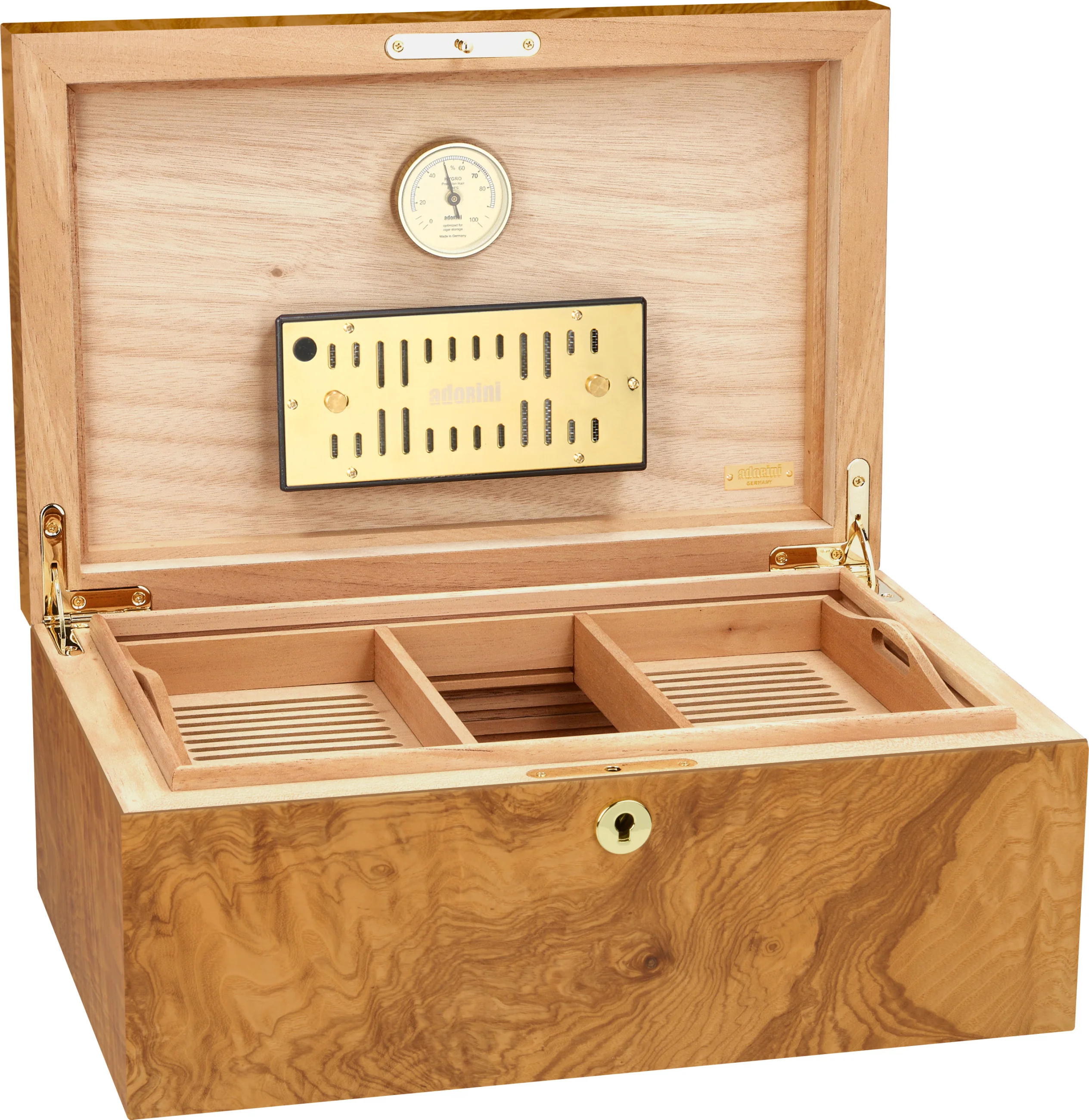 Der adorini Humidor Olivenesche Specially Selected Grande ist ein eleganter Humidor der Größe Grande aus der im Jahr 2025 neu präsentierten Kollektion Specially Selected. Der Name „Specially Selected“ steht für sorgfältig ausgewählte Echtholzfurniere europäischer Herkunft.