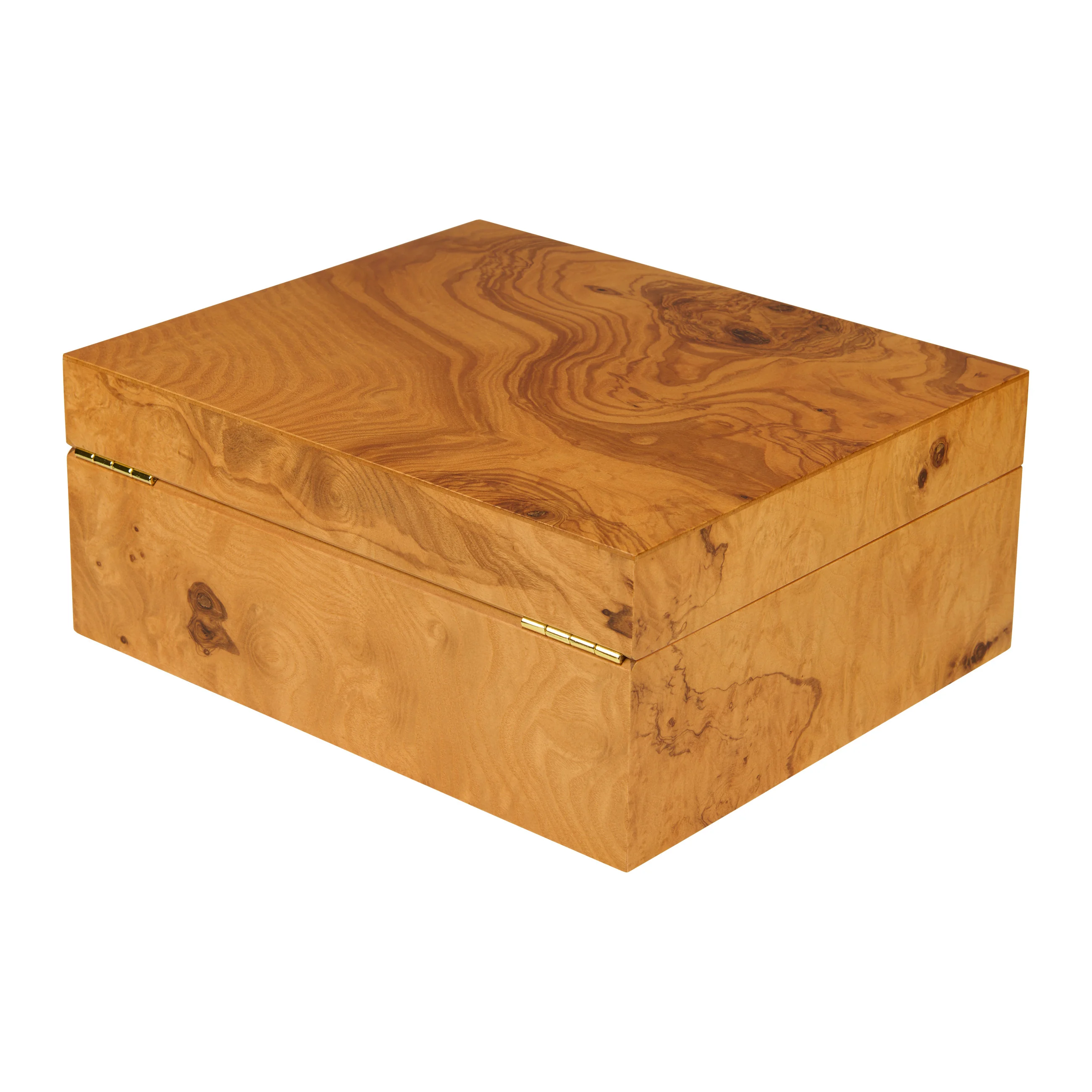 Mithilfe der horizontalen und vertikalen Divider sowie der Label Clips lässt sich der Innenraum noch stilvoller organisieren und unterteilen. Geziert von goldenen Elementen wie Schloss und Scharnieren ergibt sich im Inneren ein harmonisches Gesamtbild in Kombination mit dem Olivenholz-Furnier.