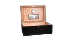 Der moderne und funktionale Humidor der Marke adorini aus der Serie Basic in der Größe L überzeugt mit seiner matten schwarzen Oberfläche und Vielseitigkeit. Mit Platz für ca. 150 Zigarren oder auch kleinere Zigarrenkisten bietet er eine ideale Lösung für die sichere Lagerung Ihrer Zigarren. Im Lieferumfang sind ein analoges Hygrometer und ein passiver Schwammbefeuchter enthalten. Das Hygrometer misst die Luftfeuchtigkeit auf Basis einer Metallspirale und wird zusammen mit dem Befeuchter magnetisch und flexibel im Deckel des Humidors befestigt. Außerdem ist der Humidor zum Schutz vor fremden Zugriff mit einem Schloss ausgestattet. Im Zubehör ist ein doppelter Schlüsselsatz sodass Sie über einen Ersatzschlüssel verfügen. Der Humidor besitzt matt silberne Scharniere im Innenraum und eine besonders starke Dichtungslippe, die für den optimalen Erhalt der Luftfeuchtigkeit sorgt. Ein vertikaler Divider ermöglicht zusätzliche Unterteilung des Innenraums. Eine zusätzliche und herausnehmbare Etagere organisiert den Humidor auf ästhetische und Funktionale Art und Weise. Es ist herausnehmbar und ist mit Ventilationsrillen ausgestattet für die optimale Zirkulation der Luftfeuchte.