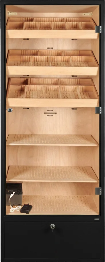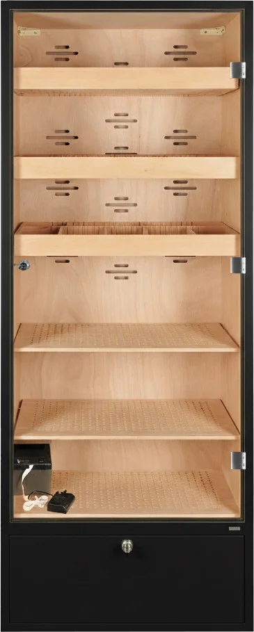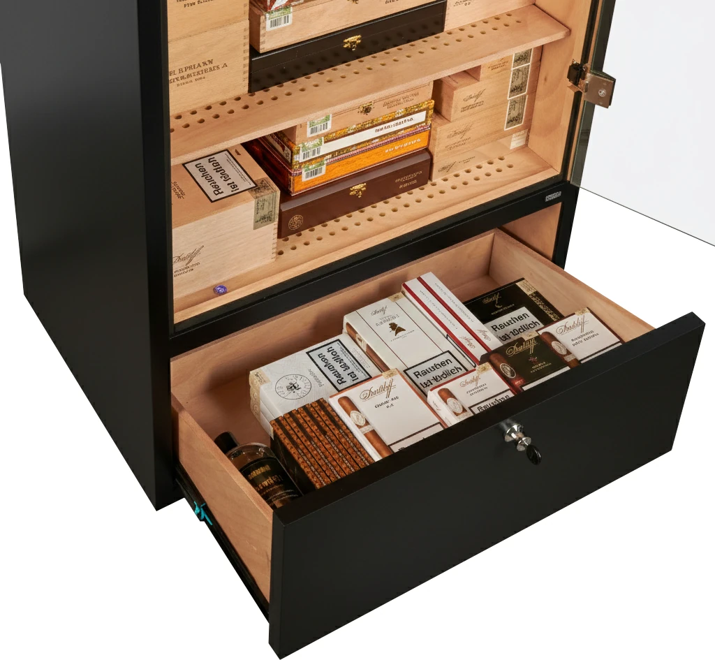 Im Sockel des Humidorschranks befindet sich eine abschließbare Schublade, die sowohl zur Zigarrenlagerung als auch zur Aufbewahrung von Zubehör oder Verbrauchsmaterial wie destilliertem Wasser genutzt werden kann. Der Boden über der Schublade ist gelocht und somit in das Klima des Innenraums integriert, sodass die Luftfeuchtigkeit auch diesen Bereich erreicht und eine sichere Zigarrenlagerung möglich ist.