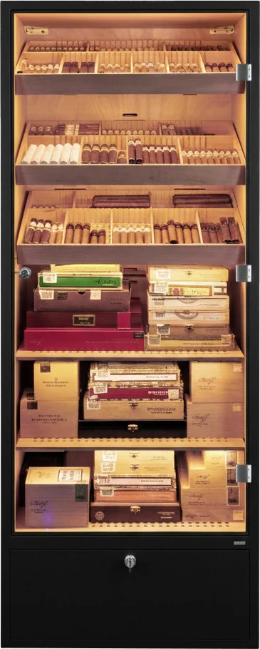 Der Humidorschrank bietet Platz für circa 2.800 Zigarren, berechnet auf Basis des klassischen Mareva-Formats. Die Lagerung ist sowohl für einzelne Zigarren als auch für ganze Zigarrenkisten ausgelegt. Der Innenraum ist auf sechs Ebenen unterteilt und mit drei Trays sowie zwei Einlegeböden ausgestattet.