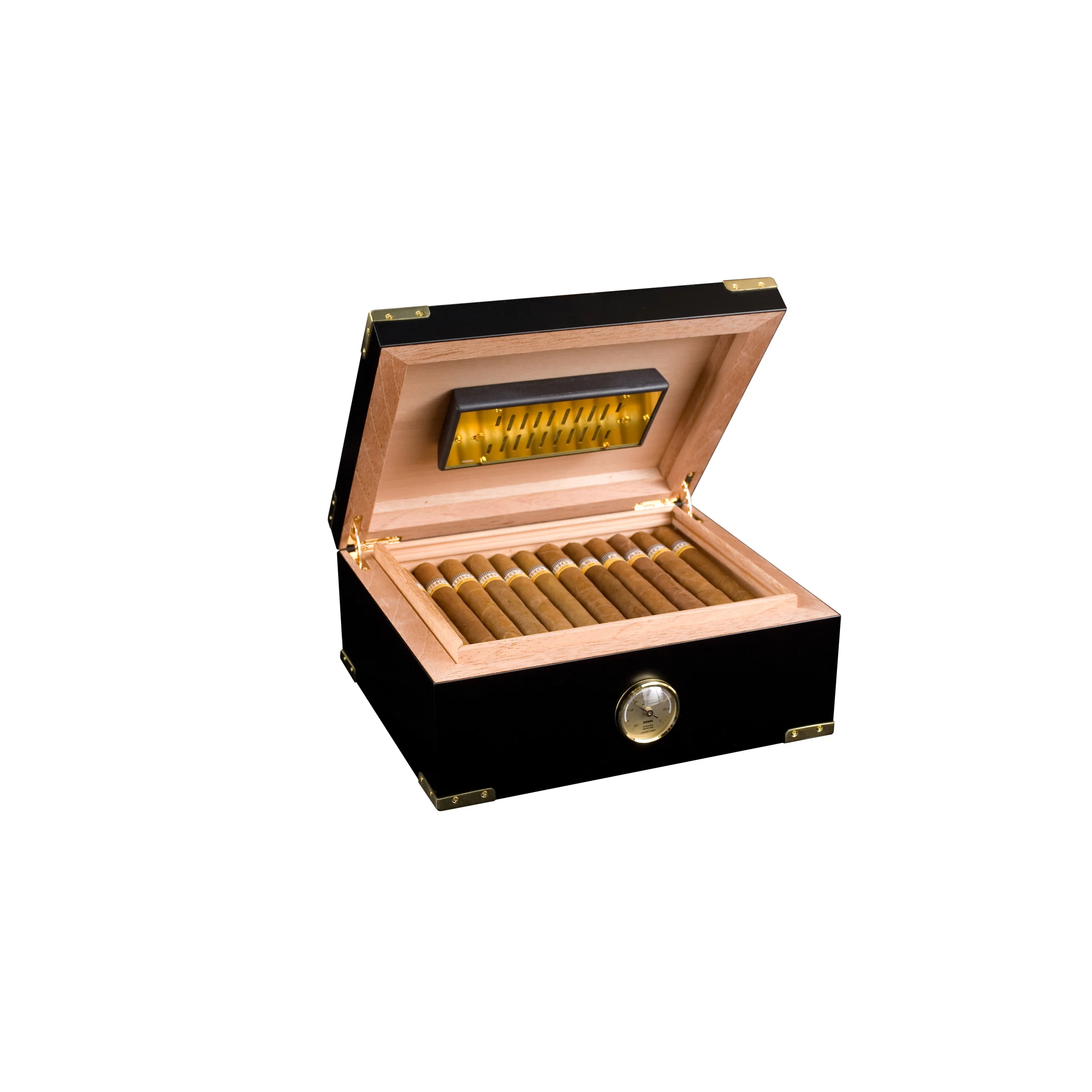 Dieser Humidor erinnert an die alten Reisekoffer mit Beschlägen und lässt Sie mit seiner klassischen schwarzen Lackierung und den vergoldeten Messing-Eckenschützern von Reisen auf dem Ozean träumen. Ein an der Vorderseite angebrachtes analoges Präzisions-Haarhygrometer verleiht dem Äußeren einen weiteren Hauch von Wertigkeit, während ein extradicker Korpus für eine robuste und langlebige Konstruktion sorgt. Hochbelastbare, 24-karätig vergoldete Quadrantenscharniere sorgen für einen reibungslosen Ablauf beim Öffnen des Deckels und geben den Blick frei auf einen Innenraum aus gedämpfter spanischer Zeder mit den exklusiven RibTech-Lüftungsrippen von adorini für eine verbesserte Luftzirkulation.