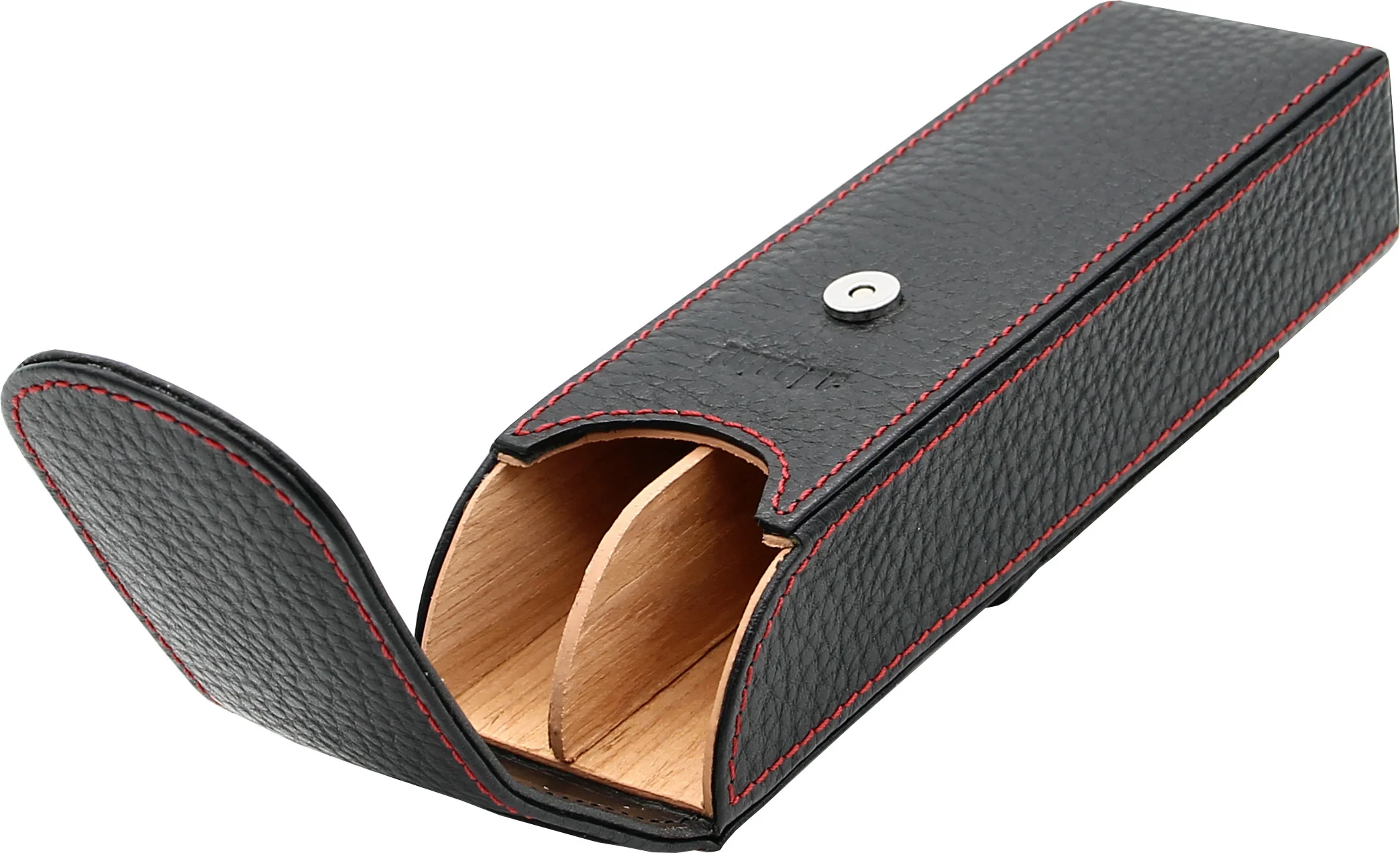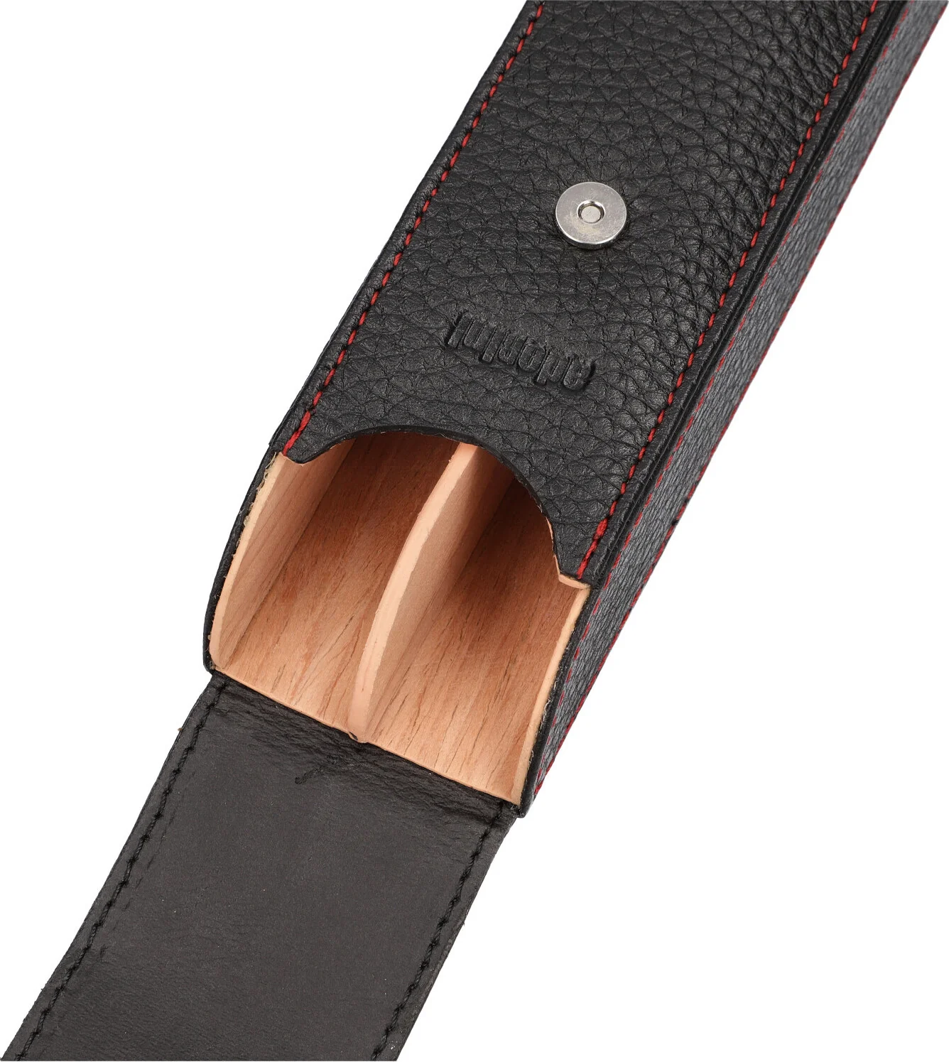 Das Etui bietet Platz für zwei Zigarren mit einer maximalen Länge von 16 cm. Ein praktischer Magnet-Druckknopfverschluss sorgt für sicheren Halt und verleiht dem Etui eine edle Optik. Unter der Öffnungslippe befindet sich eine dezente adorini-Prägung, während die rote Ziernaht einen stilvollen Kontrast bildet und das Erscheinungsbild harmonisch abrundet.