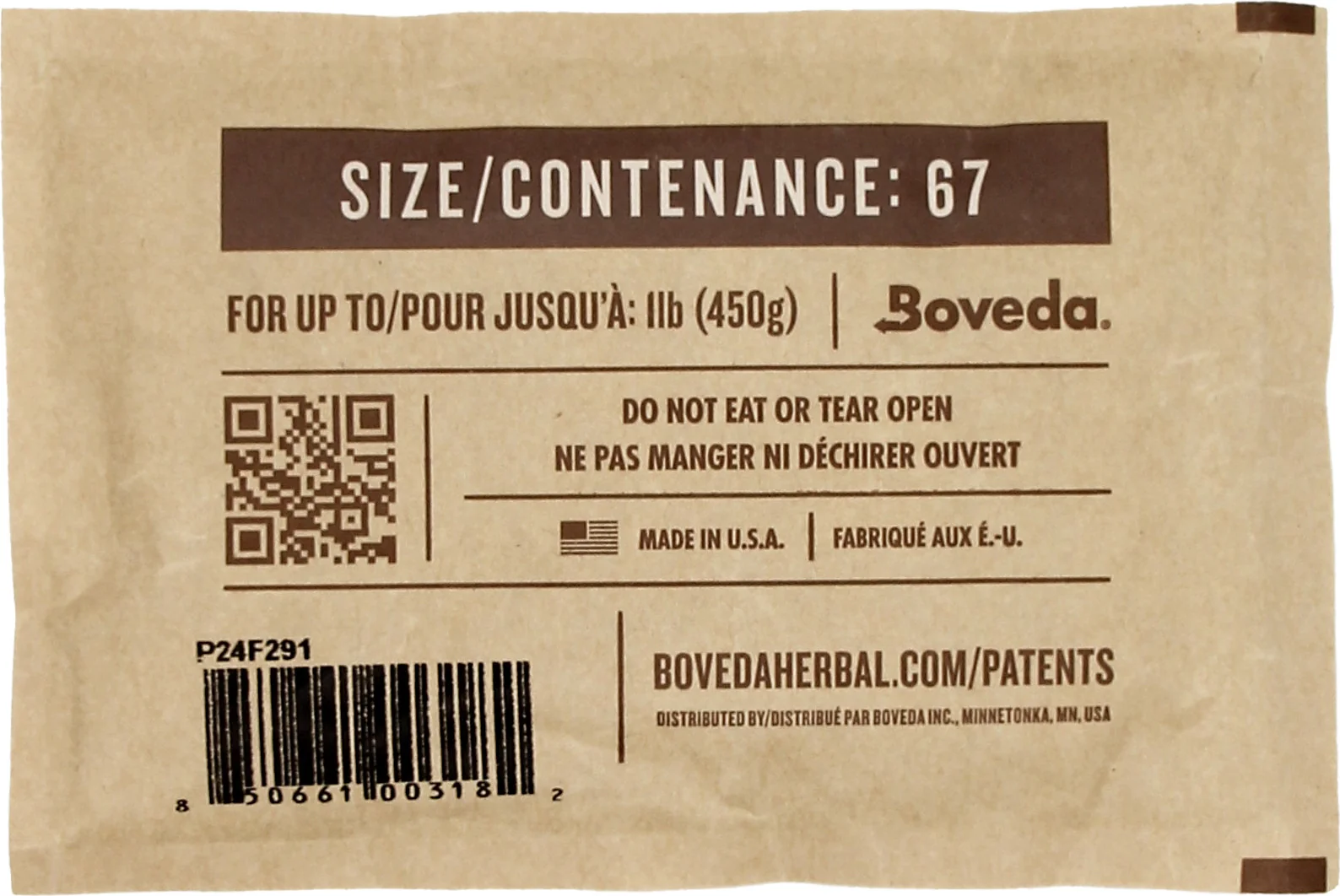Ein Boveda 62 % Pack mit 67 Gramm ist für die optimale Lagerung von etwa 450 Gramm Material ausgelegt. Abhängig vom verwendeten Behälter, der Dichtigkeit und dem Lagergut beträgt die Wirkungsdauer in der Regel rund drei Monate. Das Ende der Nutzungsdauer ist leicht zu erkennen, da sich der ursprünglich gelartige Inhalt mit der Zeit zu einem festen, steinharten Kissen verhärtet.