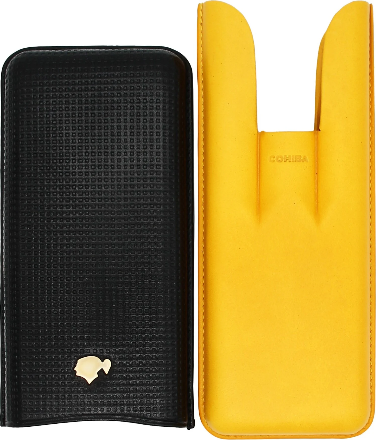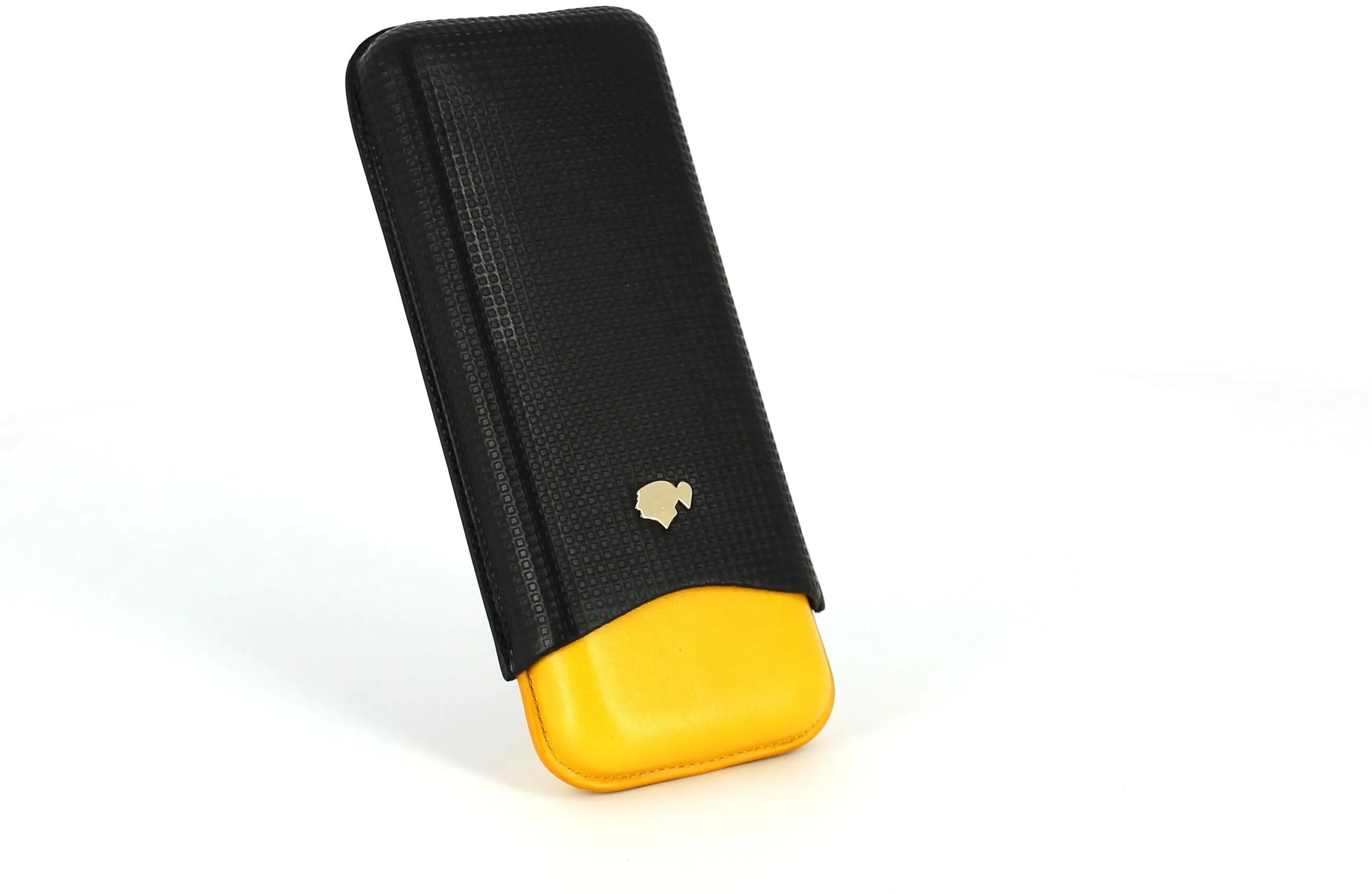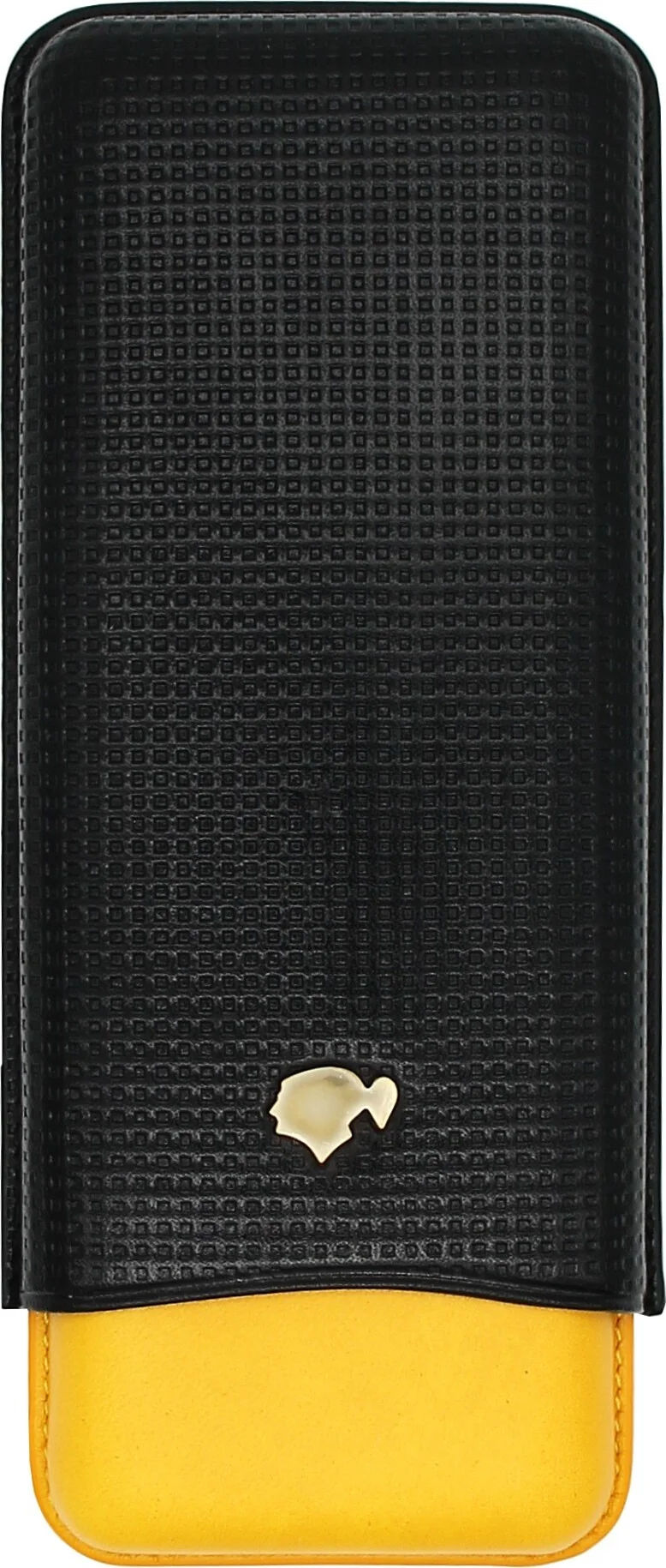 Das auffällige Zigarrenetui aus echtem, spanischem Leder fällt sofort durch seine zweifarbige Gestaltung in Gelb und Schwarz ins Auge, die Kenner sofort als Hommage an die berühmte Zigarrenbanderole der Marke erkennen. Der obere, schwarze Teil des Etuis ist mit einem strukturierten Gitter verziert, das dem bekannten, quadratischen Muster der Cohiba-Zigarrenbanderole nachempfunden ist. Die ikonische Taino-Silhouette von Cohiba in Silber rundet das Etui mit einem Hauch von Eleganz ab.