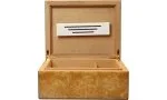 Dieser wunderbar, helle Humidor zeichnet sich durch ein natürliches Wurzelholzfurnier mit einem glänzenden Hochglanzlack-Finish aus. Hochwertige Quadrantscharniere sorgen für ein sanftes Öffnen und Schließen und verleihen dem Innenraum einen Hauch von Eleganz. Der Innenraum ist mit spanischem Zedernholz ausgekleidet und bietet zusammen mit einem mitgelieferten Divider idealen Stauraum für bis zu 50 Zigarren im Corona-Format.