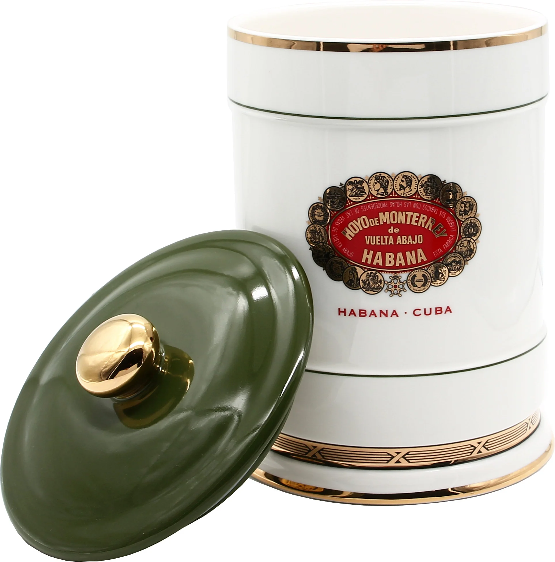 Das Hoyo de Monterrey Porzellanjar ist ein funktionales Aufbewahrungsgefäß für Zigarren der kubanischen Marke Hoyo de Monterrey. Es präsentiert sich in Weiß, Grün und goldenen Verzierungen, ergänzt durch das Hoyo de Monterrey Markenlogo auf der Front, das für die Wiedererkennbarkeit der Marke sorgt.