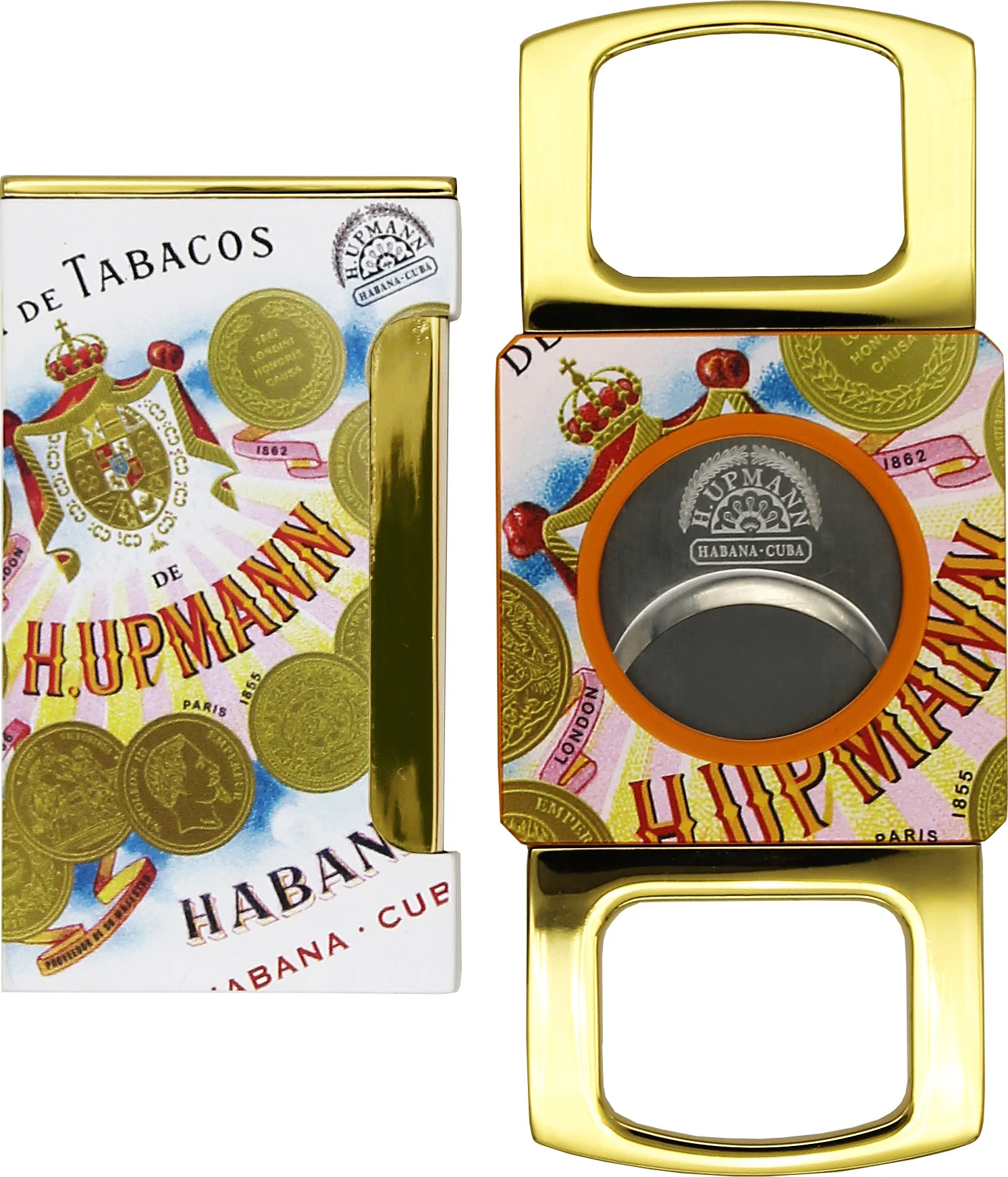 Dieses H. Upmann Feuerzeug- und Zigarrenabschneider-Set vereint zwei hochwertige Accessoires der traditionsreichen kubanischen Zigarrenmarke H. Upmann. Beide Set-Bestandteile sind auf beiden Seiten mit den markentypischen H. Upmann Medaillenmotiven und dem Markenlogo in Orangetönen versehen, was eine unverwechselbare und markentypische Optik erzeugt.