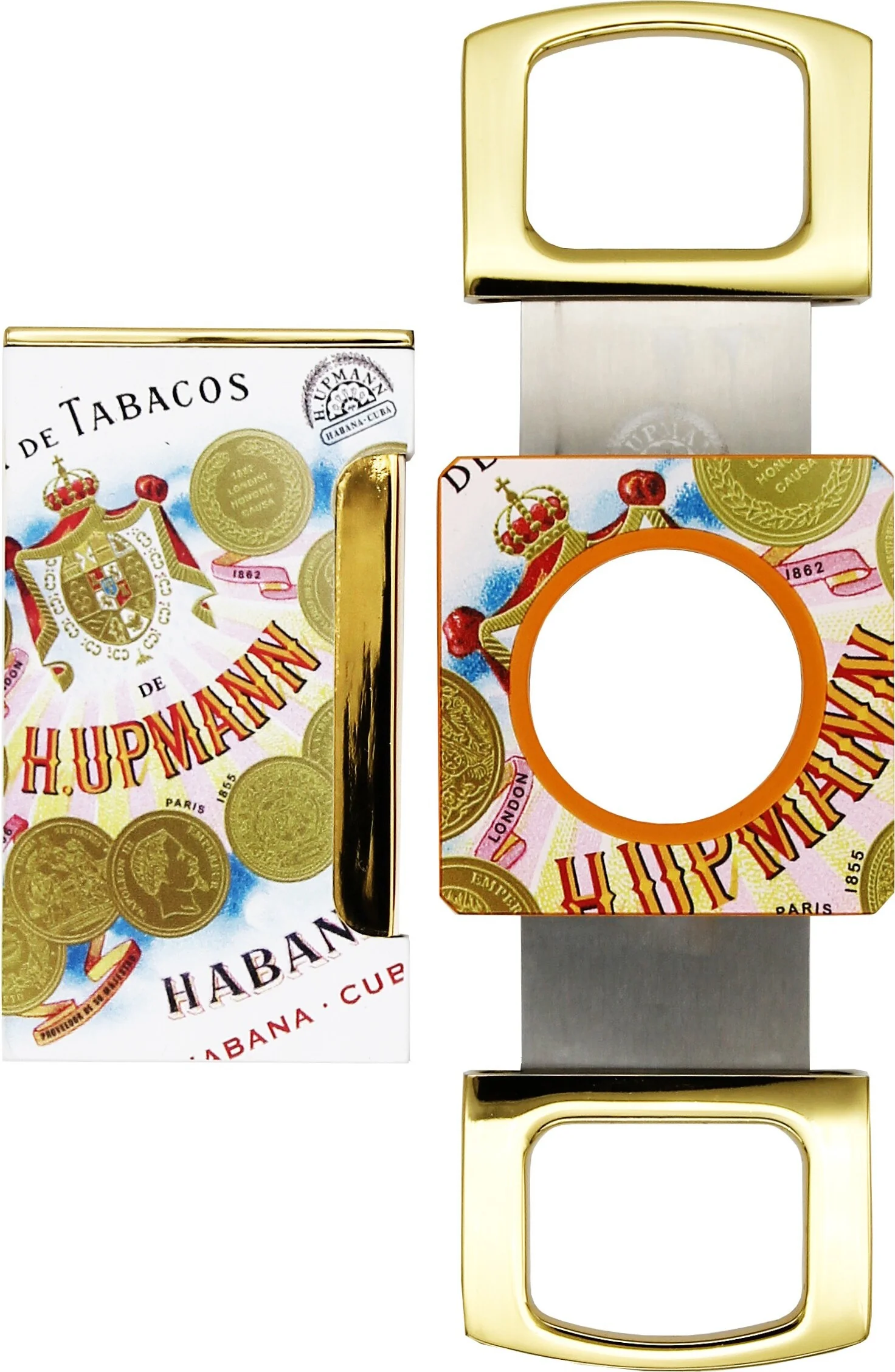 Der Doppelklingen-Zigarrenabschneider besitzt schräg geschliffene Edelstahlklingen, die ein sauberes und zuverlässiges Anschneiden der Zigarre ermöglichen. Eine der Klingen ist zusätzlich mit der Lasergravur des H. Upmann Logos versehen und unterstreicht den hochwertigen Gesamteindruck.