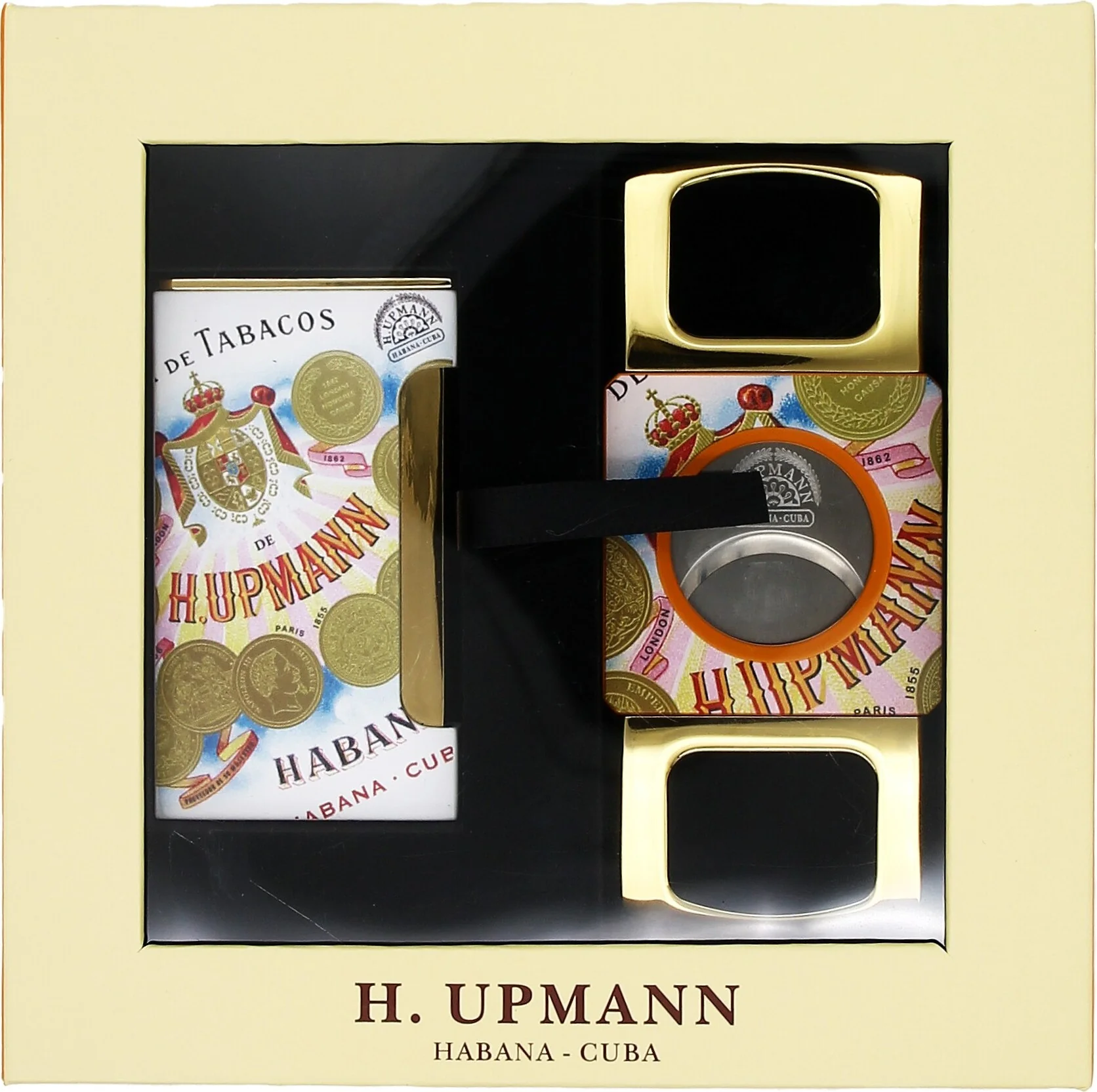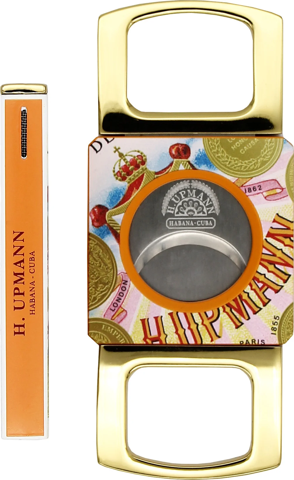 Die orangen H. Upmann Logos werden durch glänzende goldene Akzente ergänzt, die sowohl Feuerzeug als auch Abschneider eine exklusive Ausstrahlung verleihen. Das Zusammenspiel aus Orange, Gold und hochwertiger Verarbeitung macht dieses Set zu einem eleganten und modernen Begleiter für jeden Zigarrenliebhaber.