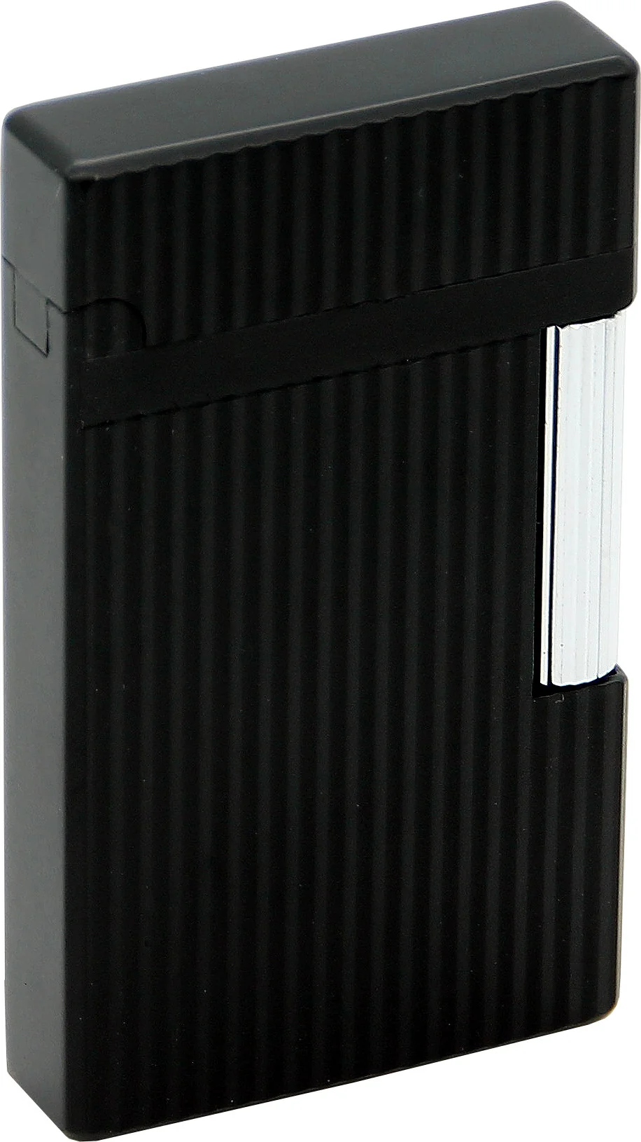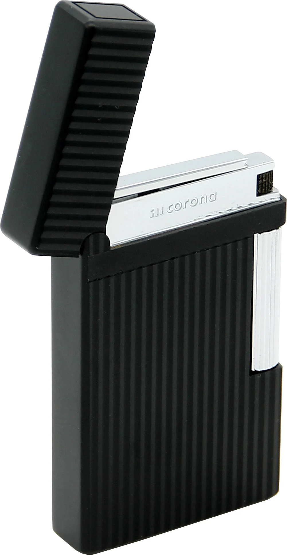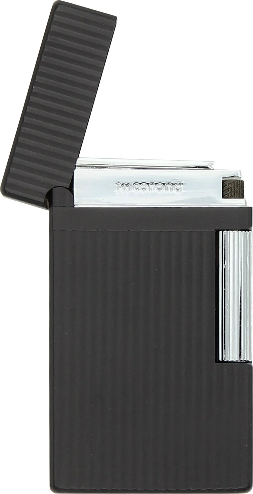 Das IM Corona Double Corona ist ein elegantes Feuerzeug in matt schwarzer Ausführung mit glänzenden silbernen Zierelementen, das klassische Formgebung und moderne Eleganz vereint.