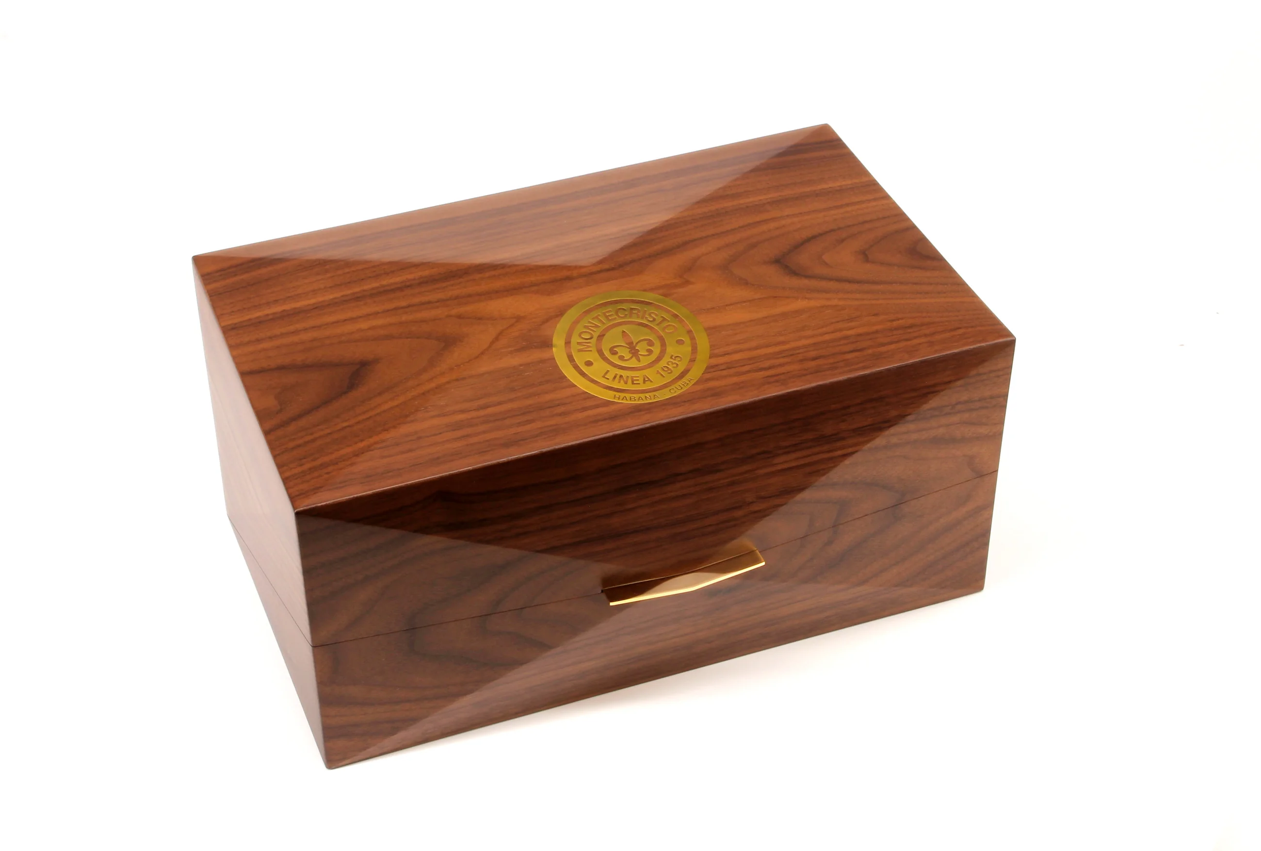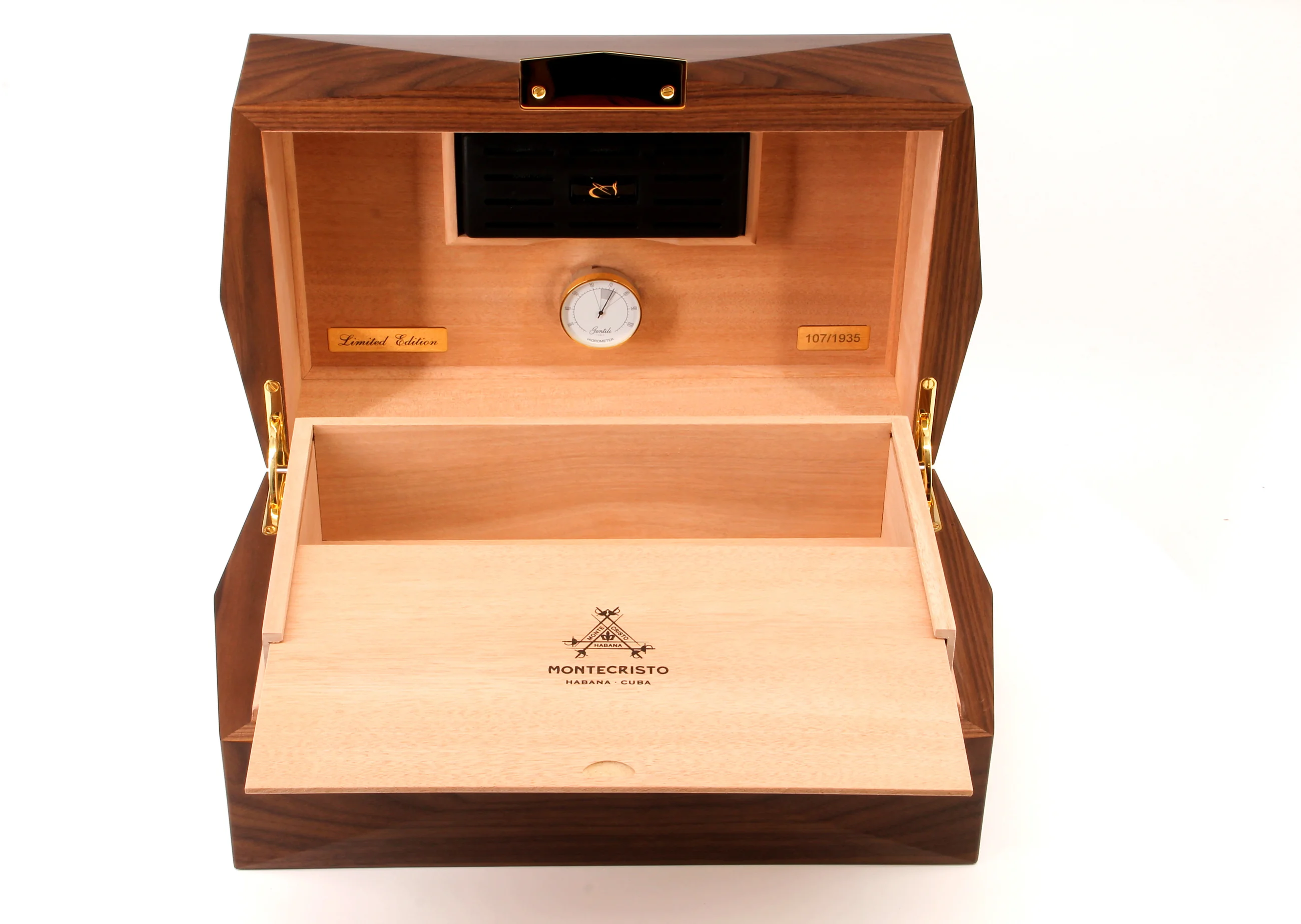 Dieser atemberaubende Humidor in limitierter Auflage wurde in Italien aus massivem Zedernholz gefertigt und ist ein robuster und langlebiger Blickfang in jedem Raum. Jede Seite des Humidors ist abgeschrägt und mit einem tiefbraunen Finish versehen, das an den Karmelit-Lack der Linea 1935 Zigarrenkisten erinnert. Ein goldfarbenes, rundes Montecristo-Logo prangt oben auf dem Deckel, der mit einem goldenen Griff leicht angehoben werden kann.