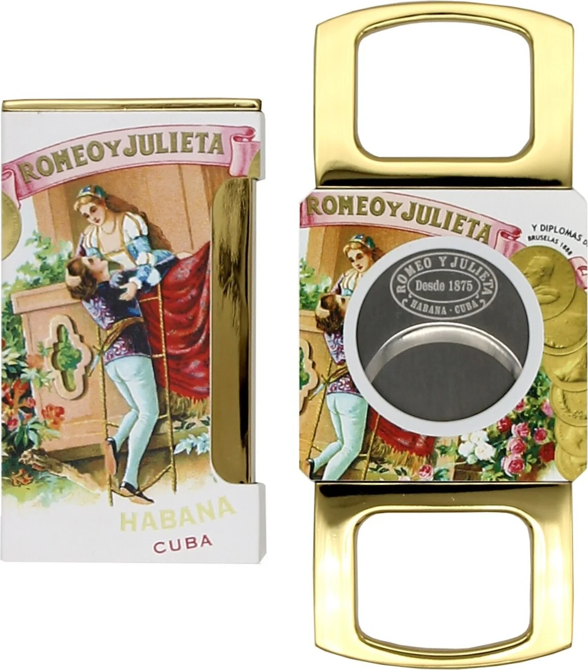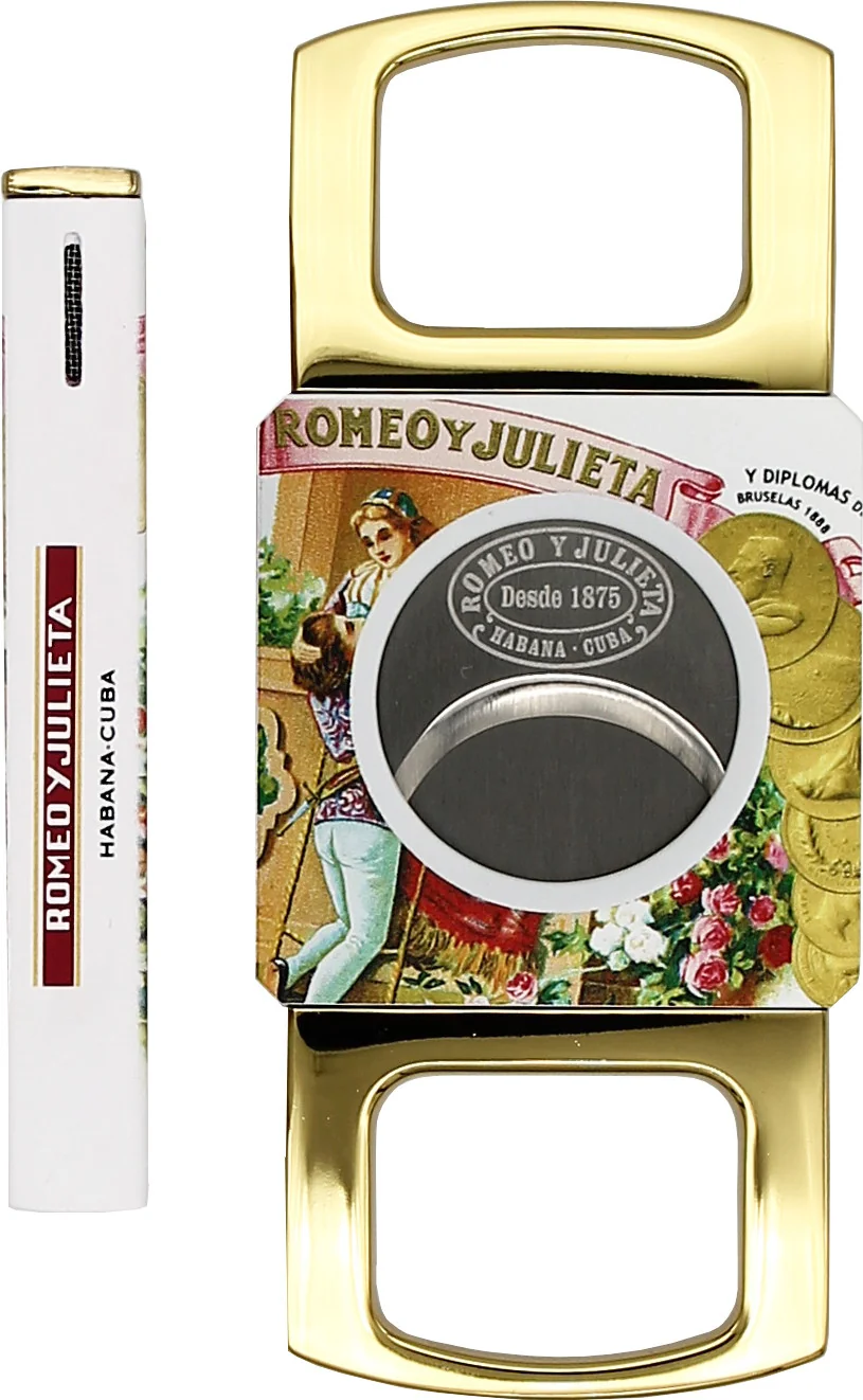 Dieses Romeo y Julieta Feuerzeug- und Zigarrenabschneider-Set vereint zwei hochwertige Accessoires der berühmten kubanischen Zigarrenmarke. Die Marke Romeo y Julieta zählt zu den bekanntesten kubanischen Zigarrenherstellern, und die weltberühmte Geschichte von Romeo und Julia findet sich auch hier stilvoll wieder. Sowohl Cutter als auch Feuerzeug sind auf beiden Seiten mit der ikonischen Balkonszene und dem Markenschriftzug versehen, was dem Set eine unverwechselbare Erscheinung verleiht.