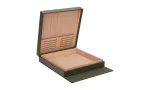 Der S.T. Dupont Reisehumidor Khaki ist ein eleganter Reisehumidor für Zigarren des französischen Luxusartikelherstellers S.T. Dupont. Dieser Reisehumidor ist auf allen Außenseiten mit feinstem, weichem Leder in der Farbe Khaki überzogen. Auf der Oberseite des Humidors ist das wiedererkennbare "D" der Marke eingeprägt, während sich auf der Vorderseite der Markenschriftzug befindet. Hinter dem Markenschriftzug verbirgt sich ein magnetischer Klappverschluss. Wird dieser heruntergeklappt, lässt sich der luftdicht verschlossene Reisehumidor öffnen, und das feinporige Okumé-Holz kommt zum Vorschein, welches hervorragende Luftfeuchteeigenschaften aufweist.