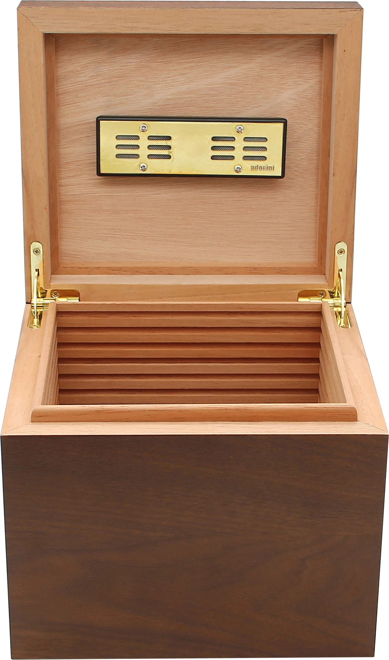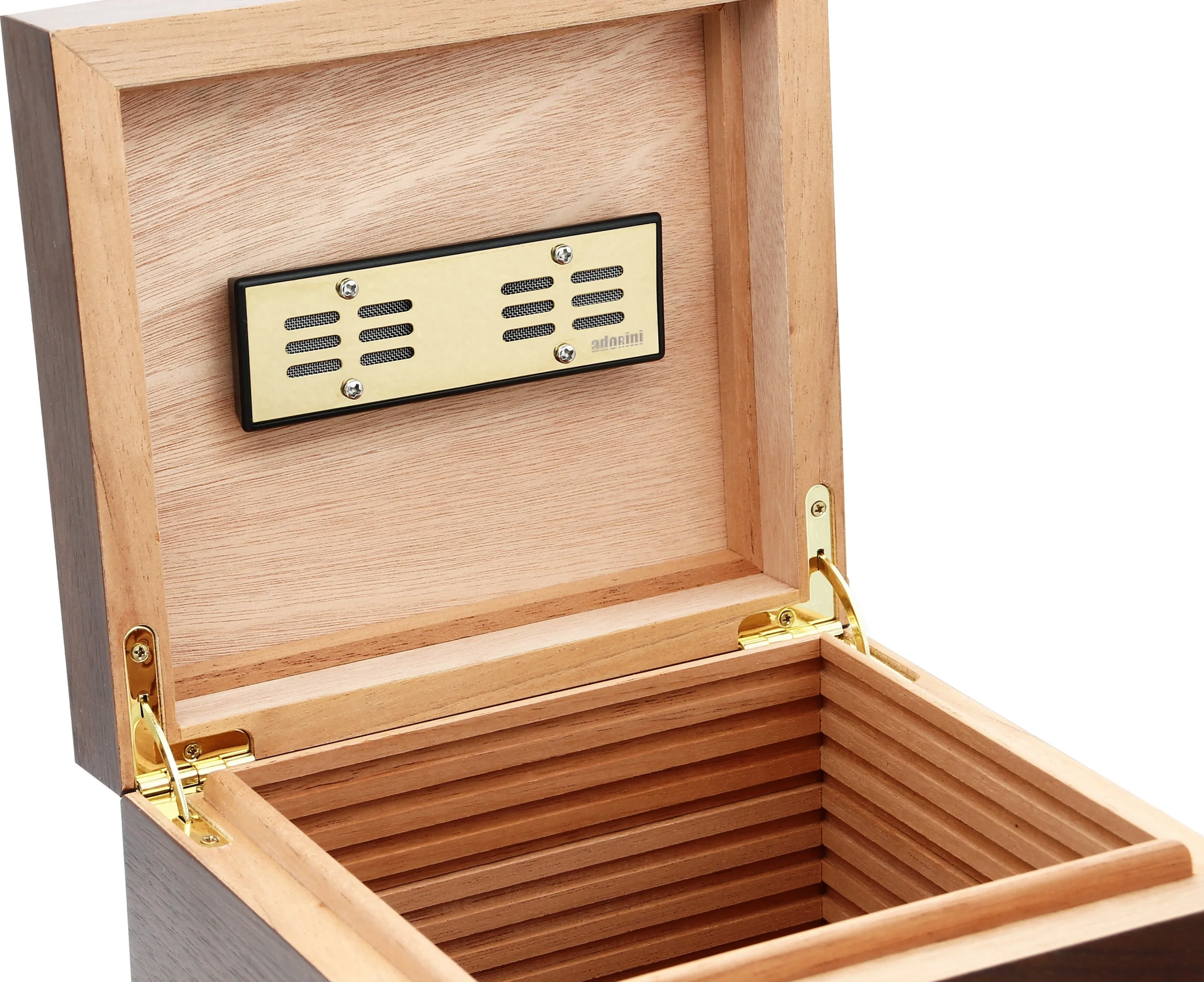 Der Vedado Humidor wird mit einem passiven Befeuchter in Gold geliefert. Dieser basiert auf Acryl-Polymer-Kristallen, die mit destilliertem Wasser befeuchtet werden sollten, um eine stabile Luftfeuchtigkeit zu gewährleisten. Dank der mitgelieferten Magnete mit abziehbarer Klebefläche kann der Befeuchter sicher im Deckel befestigt werden.