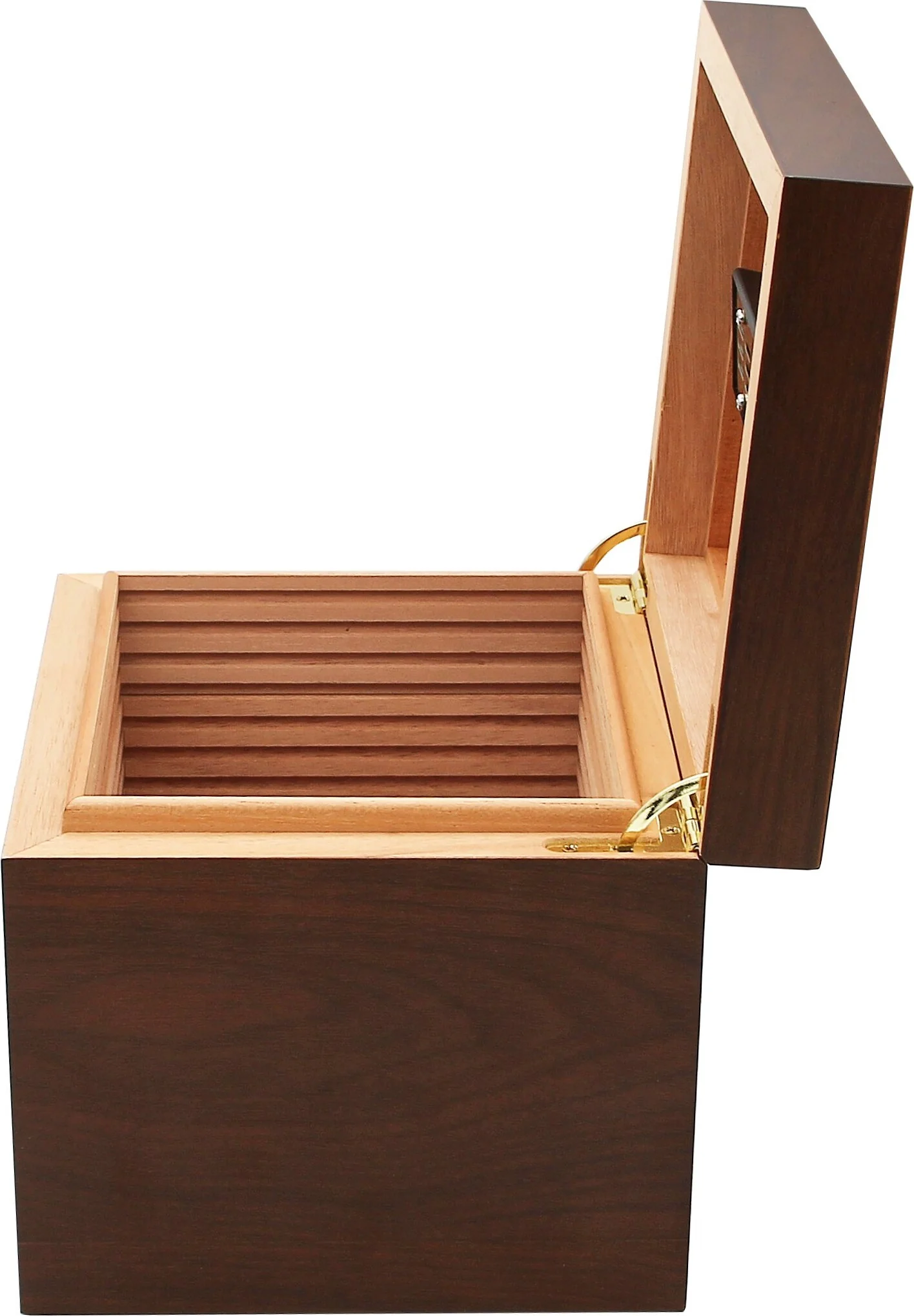 Ein Hygrometer zum Ablesen der Luftfeuchtigkeit ist nicht im Lieferumfang enthalten, der Humidor kann jedoch problemlos mit einem separat erhältlichen Hygrometer nachgerüstet werden.